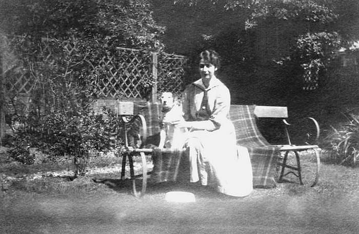 Mary Gilbert (1889-1976) and Pharoah the dog in the garden of 5 Old Orchard Road in 1918.