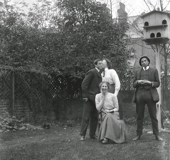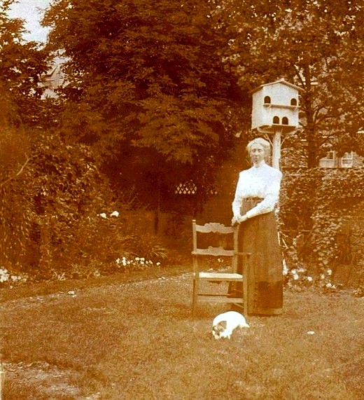 Alice L Morris (1859-1922, aunt of the Gilbert children) in the garden of 5 Old Orchard Road around 1913, with the dovecote and Pharoah the dog.