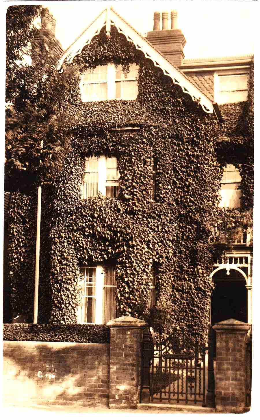 The front of the house remained largely unchanged when photographed (above) by H R Gilbert in 1994, although the ivy, the chimneys and the wrought iron gate had gone.