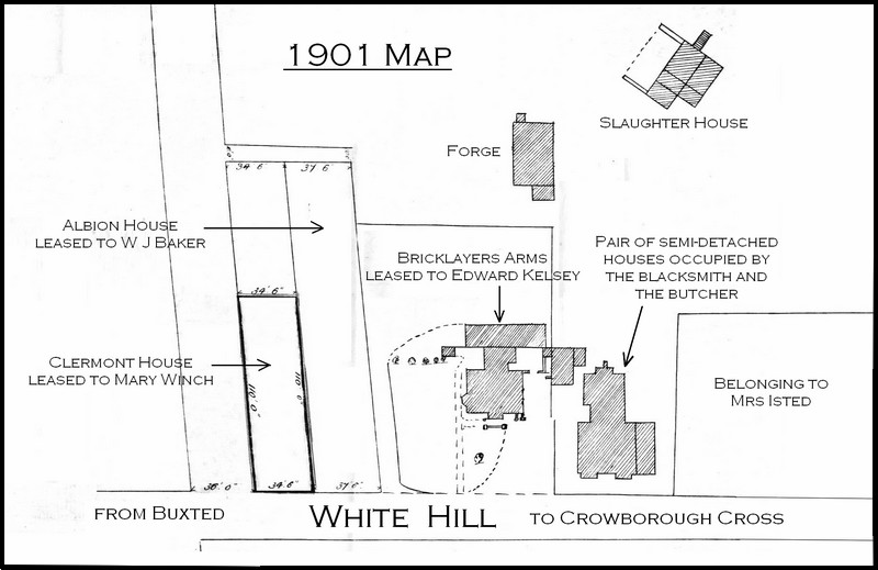 By 1911 Albion House was being used as a Post Office and, at some point, Clermont House became the Conservative Club (or possibly the other way round). Mr A V Divall confirmed to Richard Gilbert senior in 1979 that he had been sub-postmaster at White Hill Post Office (possibly the former Albion House) for many years, and he bought the quarry from Harman in 1925. A narrow strip of land at right angles to White Hill Road, and corresponding approximately to the unbuilt road shown on the 1903 map, belonged to a Mr Nicholson from the 1930s and 1959. Nicholson was still alive in 1979 and known to Mr Divall. The slaughter house was demolished in 1950 but the Bricklayers Arms still stands (the earliest record I've found of the pub is in Kelly's Directory of 1882 showing George Anscombe as landlord).
