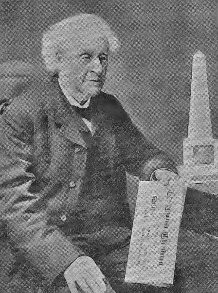 Arthur Morris (1826-1907) with a model of the Lewes Martyrs' Memorial beside him.
