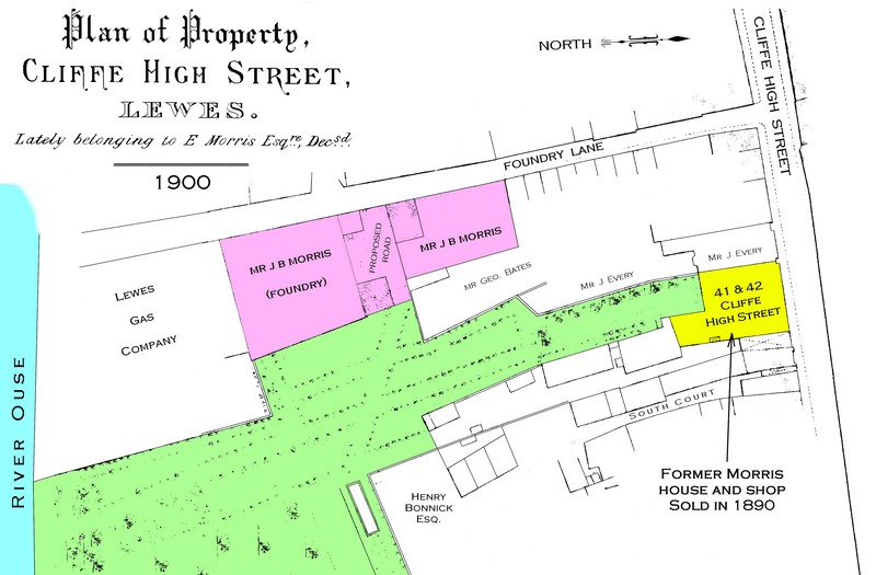 Ebenezer died on 10 October 1888 after 25 years of prosperity and the business came into the hands of his son James Berry Morris. James seems to have felt that the future lay in Eastbourne rather than Lewes and in October 1889 he appears to have mortgaged the whole property for £1500 to Elizabeth Newington of Lewes. The following year (15 July 1890) the Cliffe shop and house - 41 & 42 High Street - were sold, but the foundry was retained. East Sussex Record Office AMS 5569/15 is a bundle of particulars, plans and conditions of the sale of 41 & 42 Cliffe High Street (house, shop, offices, tinsmith's and coppersmith's works and two cottages in South Court) recorded as the residence of the late Ebenezer Morris. In 1891, the extensive grounds behind the shop were developed, and a new road formed there called Morris Road.