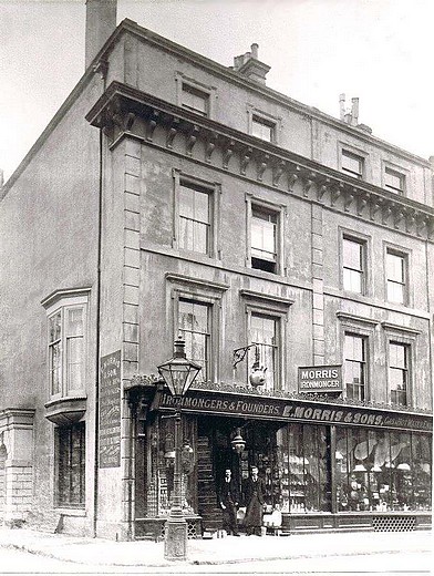 The Eastbourne shop was opened in 1850 in South Street which, in those days, extended only from the junction with Grove Road to Gildredge Road. The premises was one of four properties on the north side of South Street owned by Thomas White. Three of White's properties were described as "House and Gardens" and one as "House and Premises", so it is assumed that the Morris shop was in the latter. This would place it almost exactly where the present Dewdrop Inn was later built (in 1870).
