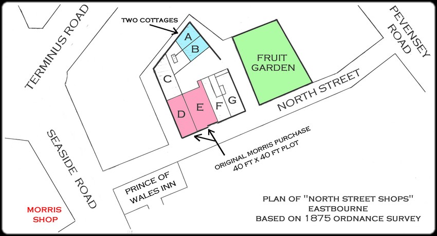 At the same time James Dexter also sold two plots immediately west of the Morris purchase, to an Edward Maynard. Maynard already owned the entire space (then largely undeveloped) between Seaside Road and Terminus Road, and James Berry Morris took the opportunity to buy from him for £41 an area of ground 40 feet x 40 feet in North Street (then called Little North Street), opposite his Seaside Road plot. This would seem to be where Morris later built a yard and workshop, to be known as the "North Street Shops" (workshops) or "The Foundry" although there is no evidence that any casting actually went on there. In later days the area was referred to as "Tinker's Town" by the employees who worked there.