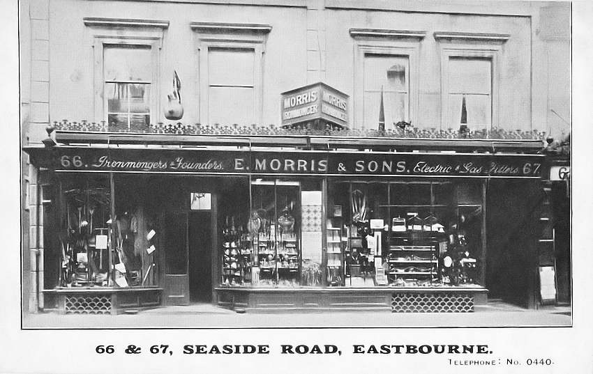Ebenezer Morris is not shown in the Rate Book for the South Street premises as a tenant after 1854, and this seems to have coincided with the ground floor of 1 Victoria Place being opened as E Morris's Eastbourne ironmongers shop. Plot No.1 which Dexter sold to Morris in 1853 was destined to become the site of the first house of a terrace stretching from what is now Elms Avenue to Terminus Road, and then called Victoria Place. The house that Ebenezer erected was therefore known as 1 Victoria Place (later 66 Seaside Road), although the front door was never in Victoria Place or Seaside Road, but in Elms Avenue.