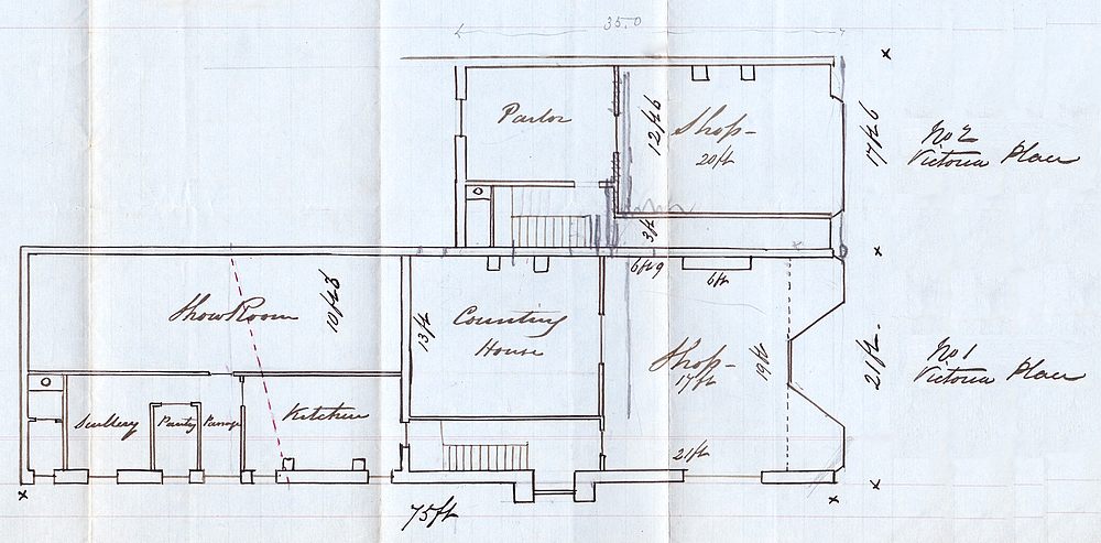 Ground floor plan of 1 & 2 Victoria Place around 1860. The Elms Avenue entrance is at the bottom of the plan.