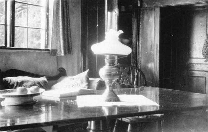 Interior of Rosebank in December 1940, photographed by William Gilbert, presumably when it was in use as a retreat from wartime Eastbourne. The willow-pattern bowl on the left (and possibly the chair) is still in the family's possession, while the oil lamp on the table suggests that there was still no electricity, or a lot of wartime power cuts!