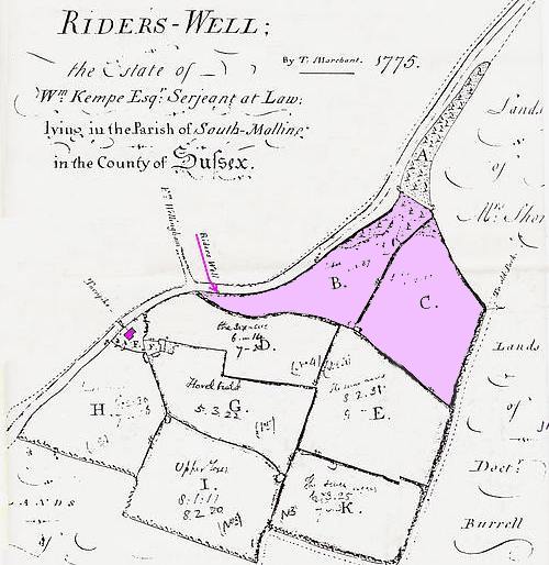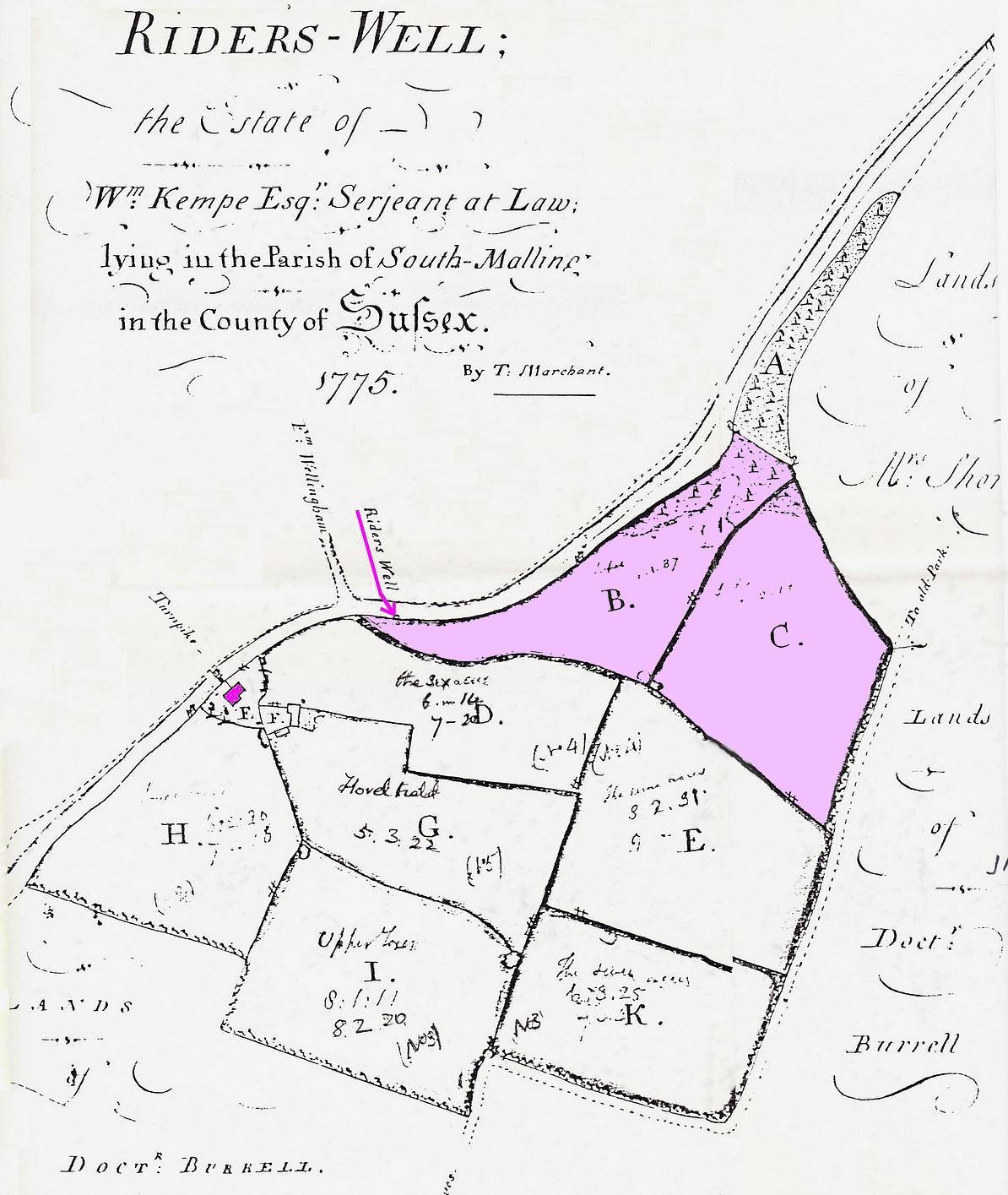 East Sussex Record Office SAS/G34/135 dated 24 September 1784 is a lease for 21 years at £240 from William Kempe of South Malling, serjeant-at-law, to Thomas Marchant the younger of Hurstpierpoint, yeoman. The propery concerned included various bits of Southerham and Stoneham and "The great and small tithes of six pieces of land called Ryders Well, part of the predial tithes of the Deanery or impropriate rectory of South Malling, dwellinghouse or part of a tenement and garden and six pieces of land part of Ryders Well Farm in South Malling on the South side of a watercourse there..." and "...a dwelling-house or tenement with garden at Ryders Well occupied by the collector of tolls at Malling Turnpike gate....two fields at Ryders Well called the Slipes and the Shaw or Coppice and all timber, mines and minerals."