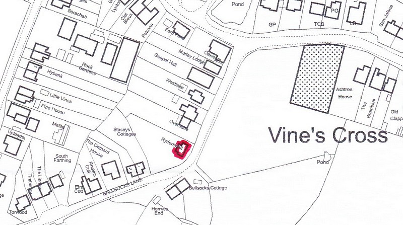 The age of the building is not known, but it doesn't appear on the 1842 Heathfield tithe map, which shows the site as being the southern portion of a large field which runs up beside Ballsocks Lane to the T-junction at the top. But it does appear on the 1875 map. Richard Gilbert (1894-1988) wrote to H R Gilbert in 1979 (Notes in { } by HRG) "Grandma Morris {Mary Sophia Morris 1831-1916} died in 1916 and Aunts Mary and Alice and Uncle Bob {who had also been living in Uckfield} had returned to live in Eastbourne by 1918; in addition, after the war {World War 1} neither Bill {William Gilbert 1892-1955} in Leeds, nor I were in a position to spend much time at Uckfield. In consequence, Mother decided to sell Ryderswell and, in its place, bought a cottage, then called Lilac Cottage, at Vines Cross in 1923."