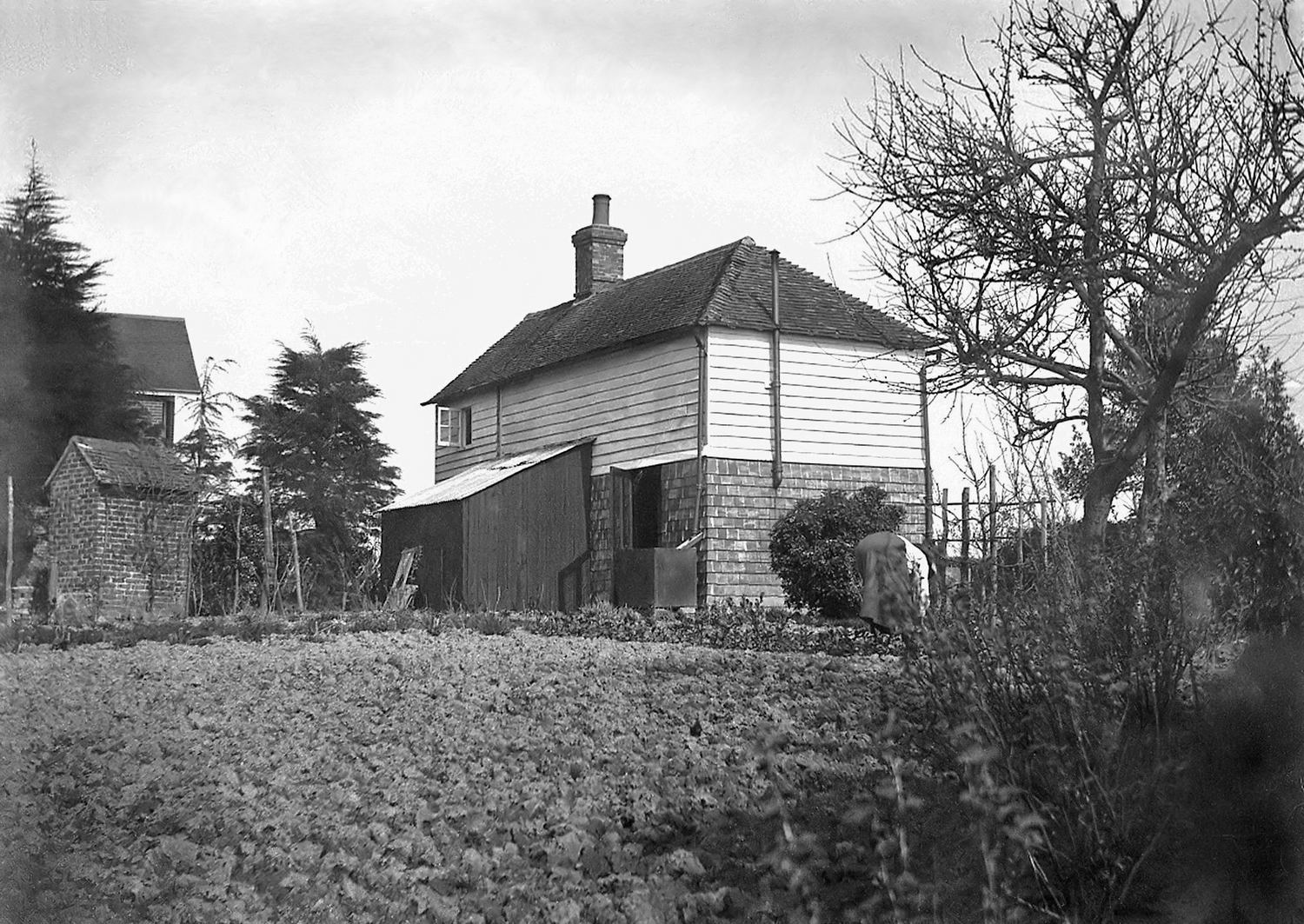 The rear of Ryderswell Cottage in the 1920s. On the left is the outside toilet. A small upper dormer window was later added to the wall facing the camera.