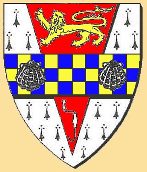 The Wimble coat of arms, showing the Lion of England granted by King William, and the thatcher's tool ("Wimble") visible in the lower red triangle.