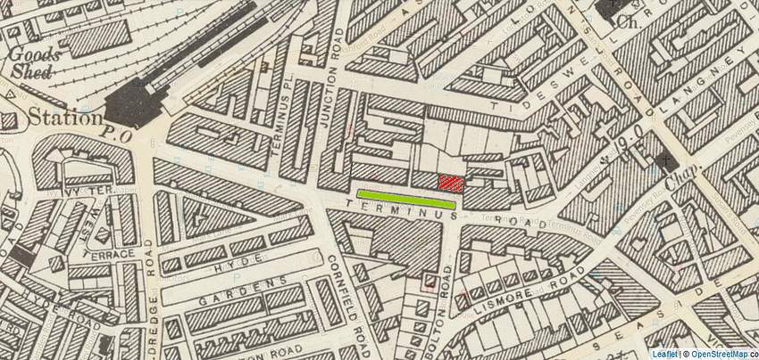 Herstmonceux Lodge was one of a row of buildings set back from Terminus Road, Eastbourne but running parallel to it, separated from the main road by a strip of grass and gardens. It was situated where the shopping mall now stands (formerly the Arndale Centre and now called The Beacon), approximately opposite Bolton Road, as marked in red on the map below (courtesy of ARCHI). By 1993 this was the area between Marks & Spencer No.133, and the sub Post Office at No.143.