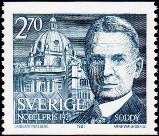 Fred Soddy shown on a 1981 Swedish postage stamp commemorating Nobel Prize winners.