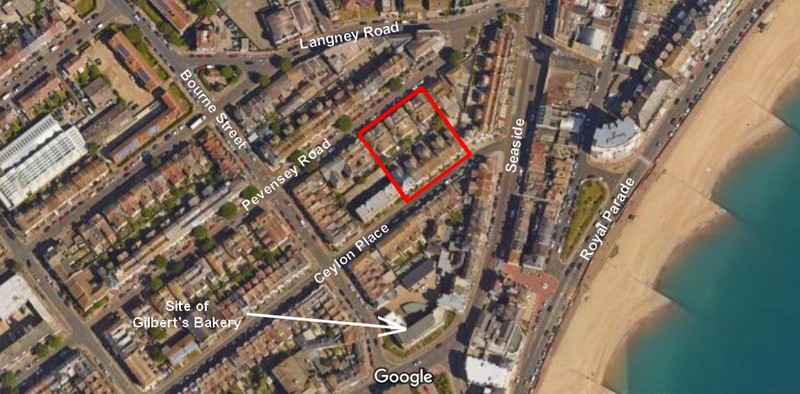 The nine 3-storey terraced houses in Ceylon Place seem to have originally been numbered 1 to 9, but were later renumbered 52 to 68 Ceylon Place (even numbers only), and still are. The rather handsome terrace is at the extreme east (Seaside) end of Ceylon Place on the north side of the road, and would have been just round the corner from Gilbert's Bakery in Bourne Street.