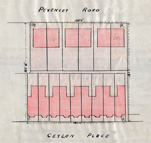 Finally in January 1886 a plan was agreed for the piece of land. An agreement was drawn up between David Gilbert (now living in retirement at 47 Terminus Road) and "The Most Noble William Duke of Devonshire" in which it was agreed that, instead of greenhouses, David would build 15 houses on the site consisting of a row of nine terraced houses in Ceylon Place, and six semi-detached properties in Pevensey Road, the designs for which had been approved by the Duke. David paid the £1682 and the land was conveyed "to the use of said D Gilbert and his heirs for ever."