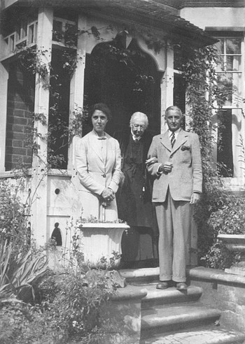 Ellen Isabel Gilbert (1857-1951) flanked by her son William and his wife Kathleen, at the front porch of 101 Enys Road around 1950.