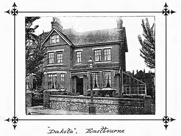 Luther died in 1932 aged 85. The Eastbourne 'Blue Book' for 1933-34 shows for Enys Road "97 (Dakota) Adams, Mrs.", suggesting that his widow Edith was still living at "Dakota". The house remains largely unchanged today, although a garage has replaced the greenhouse/conservatory seen in the picture above.