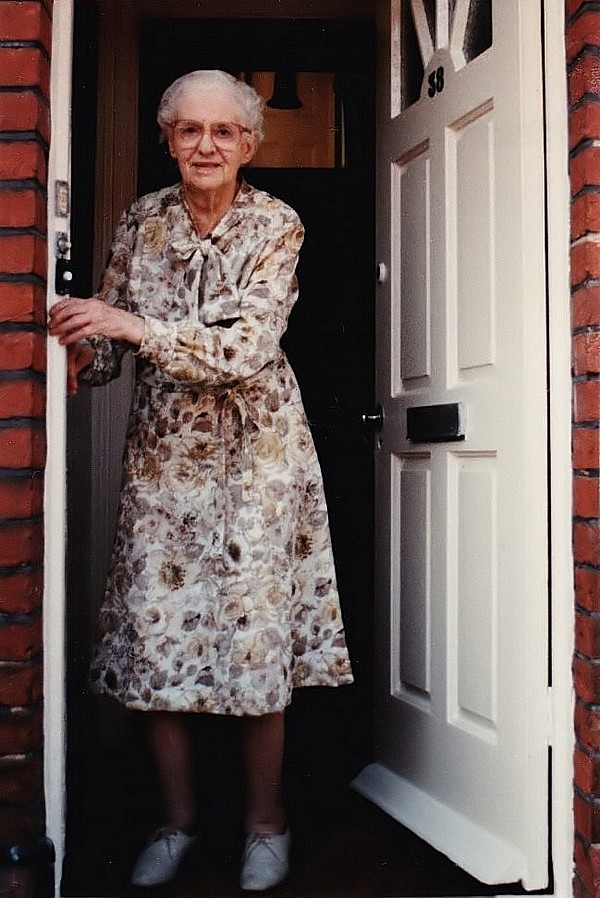 Marjorie Hewitt on 5 August 1989 at the front door of her house, 38 Gore Park Road, Eastbourne.