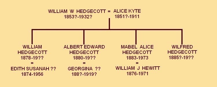 Parents; William W Hedgecott (c.1853-1932?) = Alice Kyte (c.1851-1911)