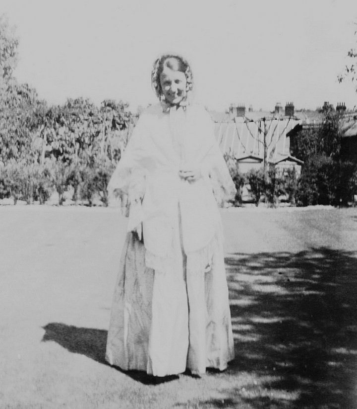 Joan Vinall at 22 Upper Avenue, Eastbourne (the Gilbert home) Whitsun 1939. She is wearing her grandmother's (Sarah) wedding gown.