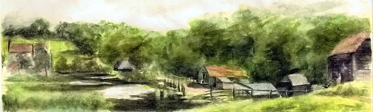 A watercolour of Tickerage by David's grand-daughter Charlotte I.Gilbert (1886-1976), painted on 24 September 1909 from the field in the background of the photograph at the top of the page. The main house and lake are on the left, the mill itself is in the centre with the red roof, and most of the other various mill buildings on the right no longer exist.