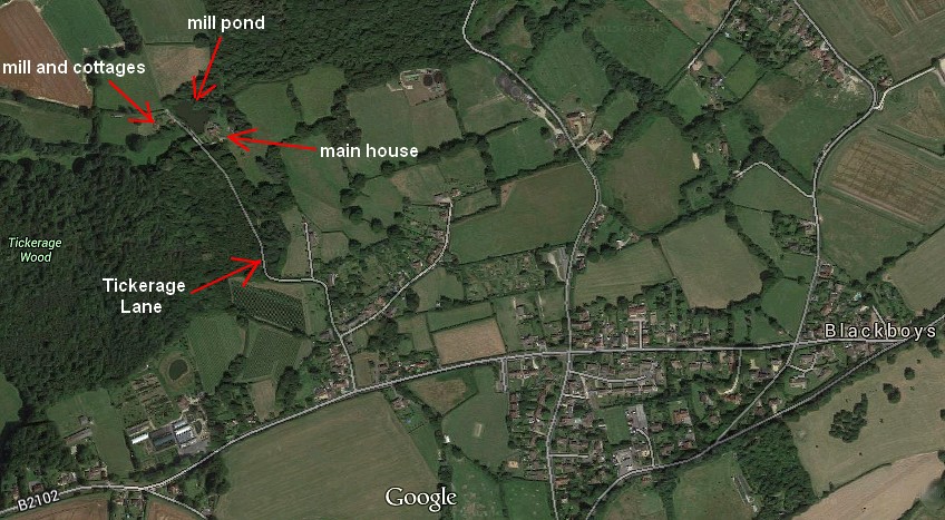 Tickerage Mill (sometimes spelled Tickeridge) is located in a valley at the far (North) end of Tickerage Lane, just west of Blackboys, off the B2102 road towards Framfield in East Sussex. The property consists of five main features - the main house, a lake (former mill pond), a water mill (now an artist's studio), the Mill Cottage, and a one-bedroom cottage which was formerly stabling.